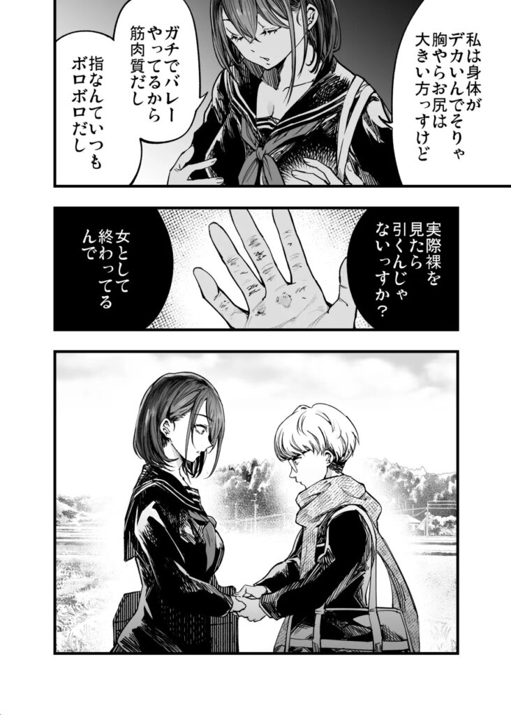 しかし、その強気な態度の裏には、バレーボールに打ち込んできた結果として筋肉質になった自分の身体や、ボロボロになった指先に対するコンプレックスが存在します 。女性としての魅力に自信が持てず、「身体目的でもいい」とさえ思ってしまう危うさと切なさが、彼女のキャラクターに深みを与えています。