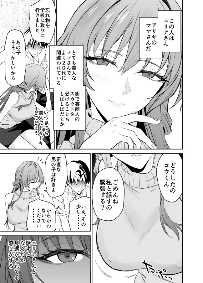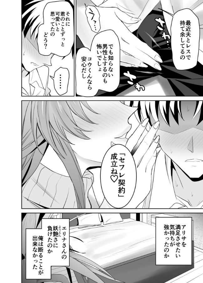 そんなコウの誰にも打ち明けられない苦悩を、思いがけない人物が知ることになります。アリサの母親である「エリナ」です 。エリナは娘がいるとは思えないほど若々しく、街を歩けば芸能人にスカウトされることもあるほどの美貌の持ち主でした 。彼女は、娘の恋人であるコウの些細な言動からその悩みの本質を見抜き、大胆不敵な提案を持ちかけます。言ってしまえば、それは「娘を満足させるためのセックスの練習台として、私とセフレ契約を結ばない?」という、常識では考えられない内容でした