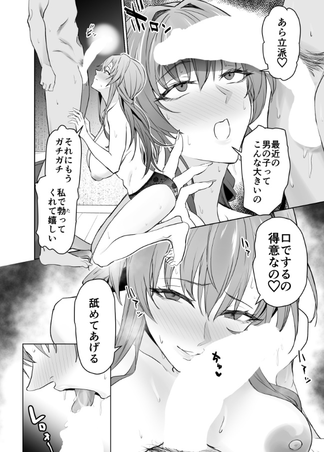 物語序盤の見どころは、エリナが圧倒的な経験値の差で、初心なコウを翻弄し、リードしていく場面です 。美しいバストへの愛撫から始まり 、手慣れた様子でコウの昂りを確かめると、濃厚なフェラチオで徹底的に奉仕します 。この時点でのエリナにはまだ「練習を手伝ってあげている」という大人の余裕が感じられ、彼女の妖艶な魅力が存分に発揮されています。コウはなすすべもなく彼女のテクニックに溺れ、快感のままに口内射精に至ってしまうのです